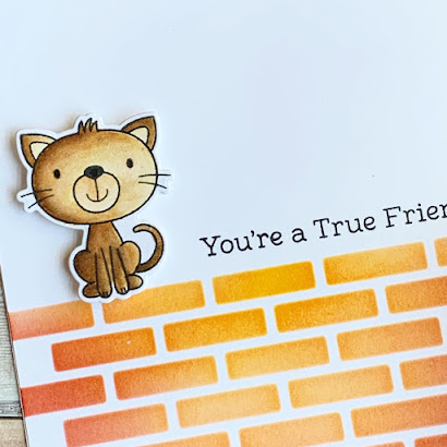 The kitten is from MFT Furever Friends stamps set. This set include some nice friendship sentiments and I used one of them. I colored the cute kitten using distress ink and cut it out using coordinating die cut. I used the Small Brick Wall stencil from MFT for the backdrop. Initially, I planned to make a one layer card, but later on, I decided to mount the kitten image on to the bricked wall just to add dimension.